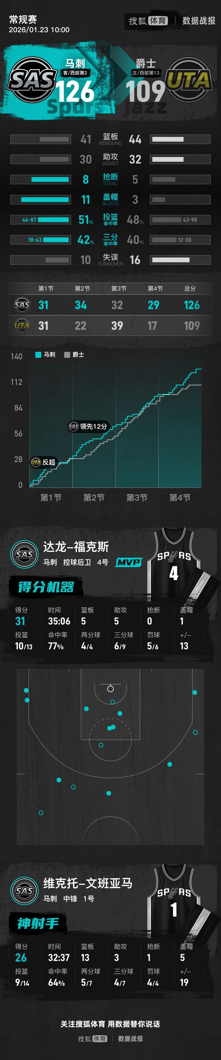简介【搜狐体育战报】北京时间1月23日NBA常规赛,客场作战的马刺以126-109击败爵士。文班亚马26分13篮板3助攻,努尔基奇17分11篮板14助攻。全场具体比分爵士队在后):31-31、34-22、