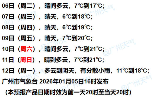 6日,广东省大部晴间多云,广东昼夜温差大,升温时间早晚寒冷。确定最低气温:粤北、广东珠三角北部市县2~5℃,升温时间其中高海拔山区零下2~1℃,有霜冻和局地冰冻,粤西沿海市县11~15℃,其余市县6~10℃。